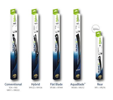 Valeo dispose d'une offre complète d'essuie-glaces incluant toutes les technologies : Essuie-glaces conventionnels à palonniers, essuie-glaces plats à vertèbres integrées, essuie-glaces hybrides et essuie-glaces spécifiques pour lunette arrière.